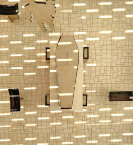 The bier is centrally placed within the space, while seating arrangements can be positioned flexibly. This adaptable setup allows mourners to choose whether to be in close proximity to the deceased or to maintain a respectful distance while saying their goodbyes.