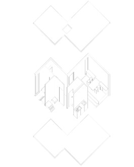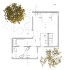 The second structure, more secluded from the public area, serves as a haven. It houses two quarantine rooms for the temporary accommodation of two to four rescued dogs, offering various resting and retreat areas for individual use. Additionally, a sleeping niche includes a foldable wall bed that can be deployed as needed.